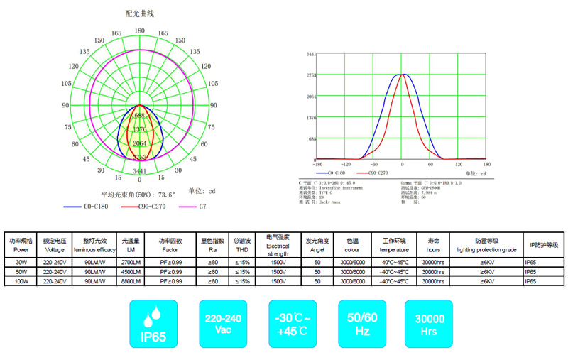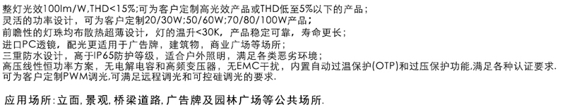 靈活的功率設計,可為客戶定制20W/30W;70/80/10W產(chǎn)品;前瞻性的燈珠均布散熱超薄設計,